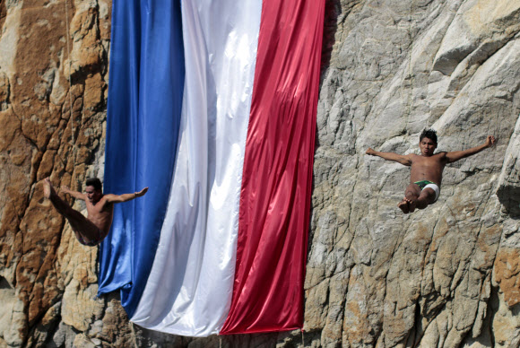 A diver jumps from La Quebrada cliff in Acapulco, Mexico on November 16, 2015, which was adorned with the French flag in solidarity with the victims of Paris terrorist attacks. ⓒ AFPBBNews=News1온라인뉴스부iseoul@seoul.co.kr