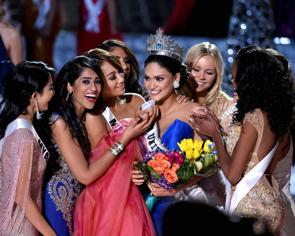 20일(현지시간) 라스베가스 네바다 플래닛 헐리우드 리조트 & 카지노에서 열린 2015 미스 유니버스 진행중 2014 미스 유니버스 파울리나 베가가 2015 미스 유니버스 왕관을 2015 미스 필리핀 피아 알론조 우르츠바치(오른쪽)에게 씌워 주자 기뻐하고 있다. 왼쪽은 처음에 실수로 2015 미스 유니버스로 지명된 2015 미스 콜롬비아 아리아드나 쿠티에레즈미스.