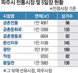 파주에 있는 전통시장은 문산자유시장(145개 상가), 금촌통일시장(291개 상가), 광탄경매시장(169개 상가), 적성한우시장(82개 상가), 봉일천시장(130개 상가) 등 5곳이다. 선유시장과 파주시장은 전통시장으로 아직 인정받지 못했다. 과거 ‘장시’로 불렸던 5일장은 금촌장(1·6일), 문산장(4·9일), 법원장(3·8일), 봉일천장(2·7일), 신산장(5·10일), 적성장(5·10일) 등 6곳에서 열리고 있다.