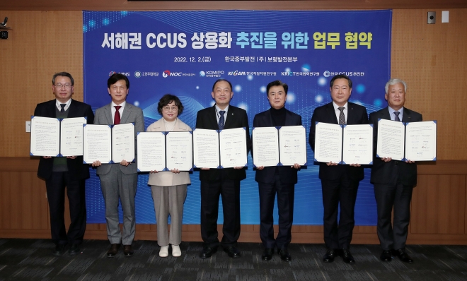 충남도는 한국중부발전 보령발전본부에서 김태흠 도지사와 원성수 공주대 총장, 김호빈 중부발전 사장, 이평구 한국지질자원연구원 원장, 이미혜 한국화학연구원 원장, 안범희 한국석유공사 ESG추진실장, 권이균 한국 CCUS추진단 단장 등과 ‘서해권 탄소포집저장활용(CCUS) 상용화 추진을 위한 업무협약’을 체결했다고 3일 밝혔다.