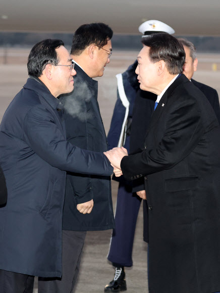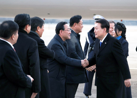아랍에미리트(UAE)?스위스 순방을 마친 윤석열 대통령이 21일 경기도 성남 서울공항에 도착해 정진석 국민의힘 비상대책위원장과 인사하고 있다. 2023.01.21 뉴시스 -
