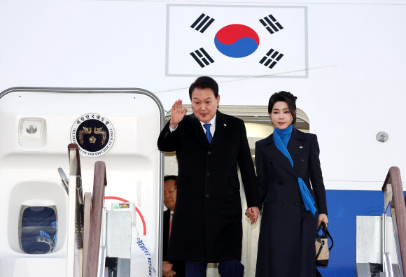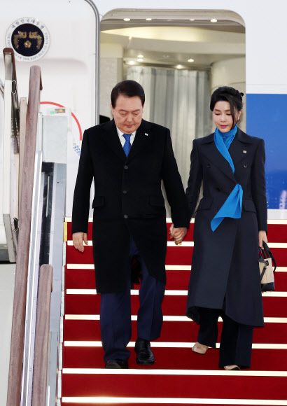 아랍에미리트(UAE) 스위스 순방을 마친 윤석열 대통령과 부인 김건희 여사가 21일 경기도 성남 서울공항에 도착하고 있다. 2023.01.21 뉴시스 -