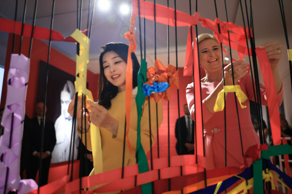 김 여사는 와지엔키 박물관의 프리다 칼로 전시를 둘러보고, 시그니처 색상을 사용한 리본 체험을 하면서 “한국과 폴란드의 관계가 하나로 엮인 이 리본처럼 더욱 끈끈해지길 바란다”고 했다.
