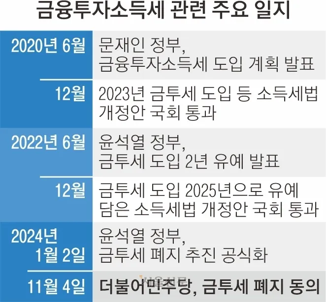 2020년 여야 합의로 국회를 통과한 금투세는 금융 투자로 얻은 이익이 일정 수준(주식 5000만원 등)을 넘으면 과세하는 제도로, 시행 시기를 두 차례 늦춰 내년 1월 1일부터 시행하기로 했다. 소득이 3억원 이하면 5000만원을 공제한 뒤 금투세 20%(지방소득세 합산 시 22%)의 세율이 적용되고, 3억원을 초과하면 금투세 25%(지방소득세 합산 시 27.5%)가 적용된다.