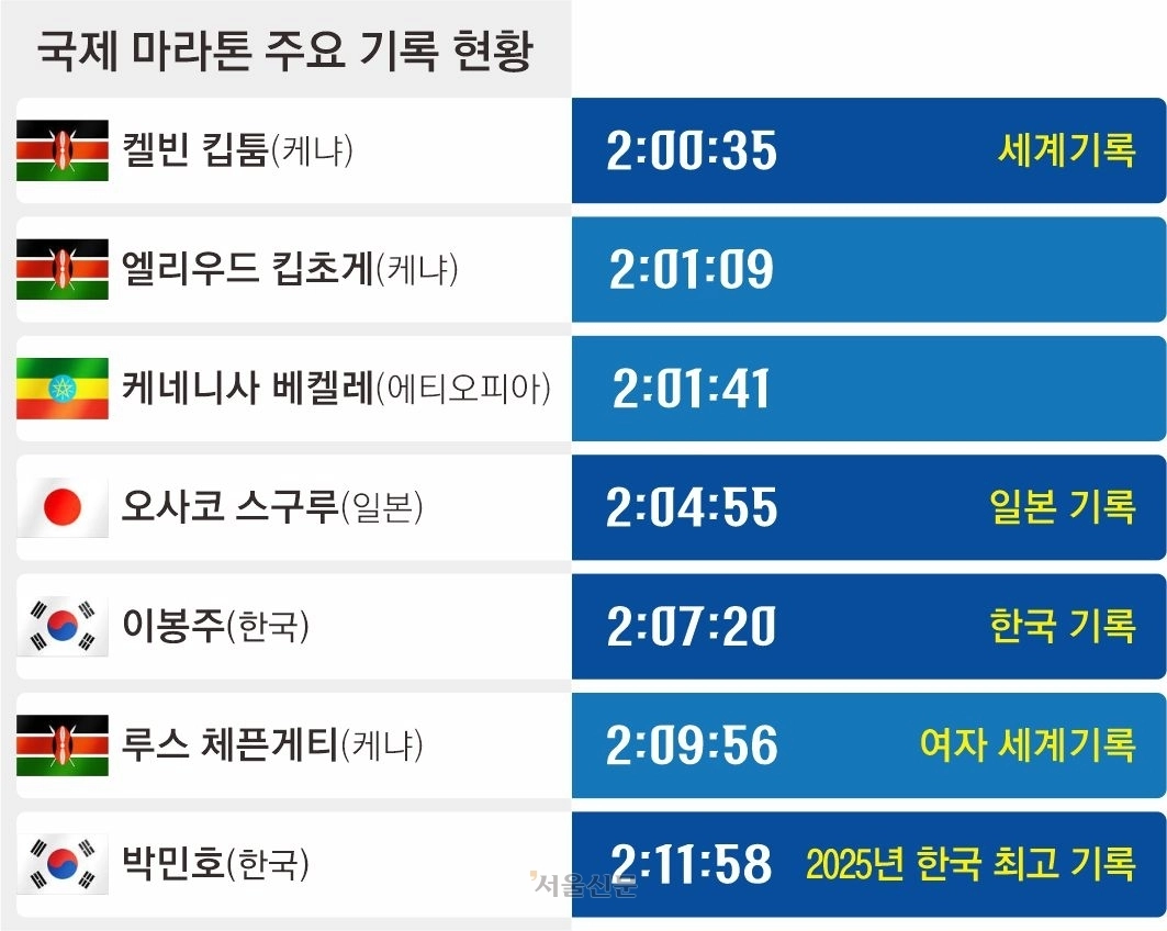 반면 한국은 1992년 바르셀로나 올림픽 금메달리스트 황영조(현 국민체육진흥공단 감독)와 2001년 미국 보스턴마라톤 우승자 이봉주 이후 국제 경쟁력이 해마다 떨어지는 양상이다. 올해 한국 마라톤 최고 기록은 지난달 23일 박민호(26·코오롱)가 인천 국제마라톤 대회에서 세운 2시간 11분 58초로, 오사코보다 7분 이상 느리다. 이는 세계 정상급 선수가 2㎞ 이상 더 달릴 수 있는 격차다. 한국 최고 기록은 이봉주가 2000년 도쿄 국제마라톤에서 작성한 2시간 7분 20초가 25년 넘게 깨지지 않고 있다.