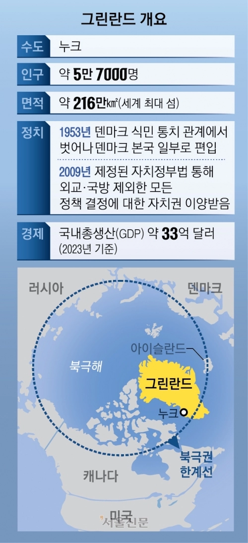 인구 약 5만 7000명의 그린란드는 300여년간 덴마크 지배를 받다가 1953년 식민 통치 관계에서 벗어나 덴마크 본국 일부로 편입됐다. 2009년 제정된 자치정부법을 통해 외교와 국방을 제외한 모든 정책 결정에서 자치권을 행사하고 있다.