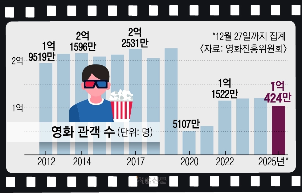2025년은 한국 영화의 위기가 현실로 다가온 해였다. 2012년 이후 코로나19 기간을 빼면 해마다 이어지던 천만 영화의 계보가 끊어졌고 누적 관객수는 1억명을 간신히 넘겼다. 코로나 팬데믹 이전 2억명에 달하던 한국 영화 연간 관객수는 엔데믹 이후에도 1억명선에 그치는 등 좀처럼 회복세를 보이지 못하고 있다. 영화계는 보편적인 대중성이 아니라 관객 개개인의 취향이 뚜렷하게 반영된 작품들이 성공하면서 기존의 흥행 공식이 재정립됐다.