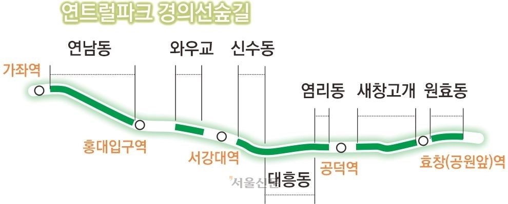 1904년 일본 제국주의가 대륙 침략과 수탈을 목적으로 용산에서 신의주까지 부설한 ‘경의선’은 남북 분단 후 철로가 끊기고 주변 개발이 이어지면서 본래 기능을 잃어갔다. 1975년 여객 운송이 중단됐고 2008년 지하화가 시작됐다. 지상 공간을 공원으로 만드는 작업도 함께 이뤄졌다. 2012년 3월 대흥동 구간을 시작으로 염리동, 새창고개, 연남동, 원효로, 신수동, 와우교에 이르는 6.3㎞ 길이의 경의선숲길이 2016년까지 차례로 완성됐다. 특히 2015년 개방된 연남동 구간은 ‘연트럴(연남동+센트럴)파크’로 불리며 외국인 관광객들까지 몰려드는 명소가 됐다.