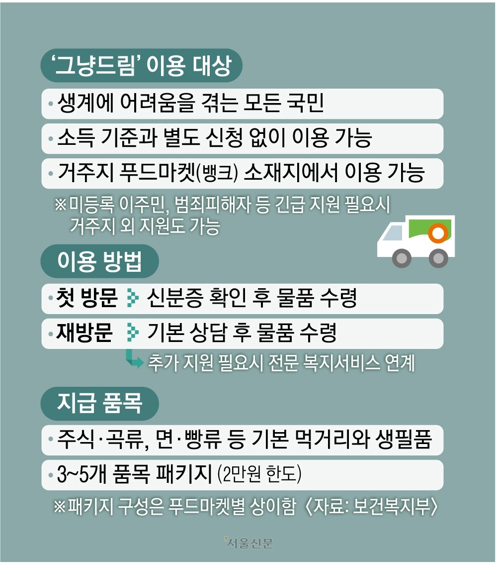 겉으로는 여느 식료품점과 다를 것 없는 공간에서 먹거리를 건네 이용자의 부담을 낮추고, 그 과정에서 드러난 위기 신호를 복지 서비스로 잇겠다는 것이 ‘그냥드림’의 핵심이다. 정부는 내년 4월까지 시범 운영한 뒤 성과를 분석해 5월부터 본사업으로 전환할 예정이다. 먹거리 구매 비용은 신한금융그룹과 한국청과 등이 지원하고 있다.