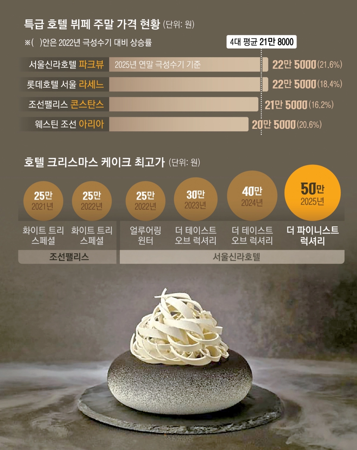 크리스마스 케이크의 경우 노골적인 최고가 경쟁이 벌어지고 있다. 현재 서울신라호텔의 한정판 ‘더 파이니스트 럭셔리’가 50만원으로 최고가다. 이 제품은 2023~24년 나왔던 ‘더 테이스트 오브 럭셔리’와 겉모습은 비슷하지만 ‘화이트 트러플’과 고가 와인 ‘샤또 디켐’ 등을 추가하면서 1년 만에 10만원 올랐다.